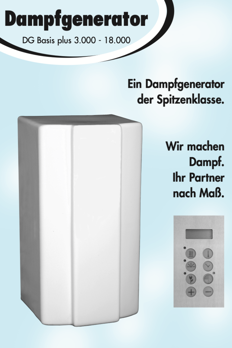 Die Dampfgeneratoren der Serie DG Basis plus, für Dampfsauna, Dampfdusche und Dampfbad, überzeugen durch ihre Form, Bauart und die enorme Dampfproduktion (kg Dampf/h).